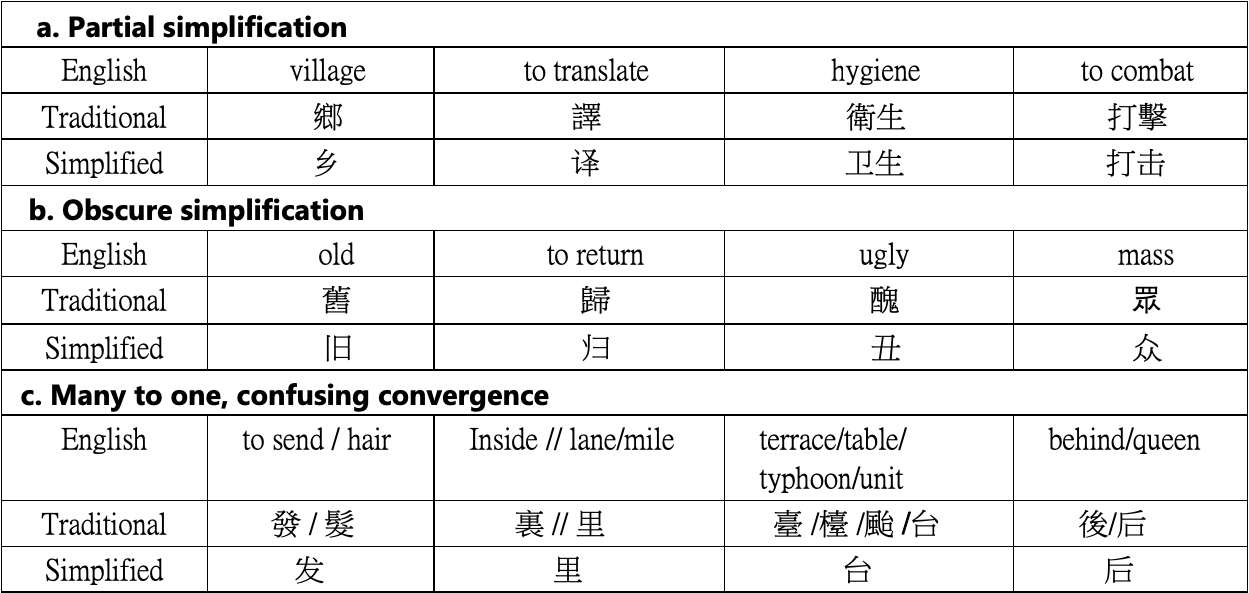 In the case of the Chinese writing system, there are mainly 3 major kinds of differences between the Traditional and the derivative Simplified Chinese characters, which ideally should have ten or less strokes.