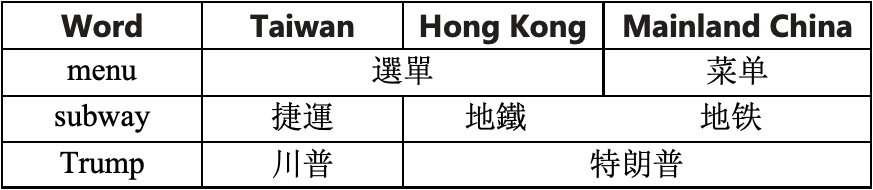 The differences in (2) reflect mostly the differences in language used in Mainland China, Taiwan and Hong Kong, as well as in the Chinese language used before 1949, when the Peoples’ Republic of China was founded.