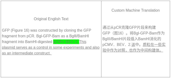A custom, domain specific, machine translation engine can produce better results than a generic MT system. Here is an example: