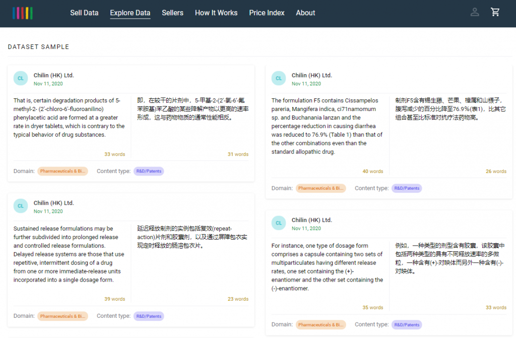 Chilin now provides English-Chinese parallel sentences on the TAUS Data Marketplace. Two large datasets related to Pharmaceuticals and Biotechnology are now available. Chilin’s parallel sentence data is provided in TMX format and can easily be processed by machine learning systems specifically for custom neural machine translation.